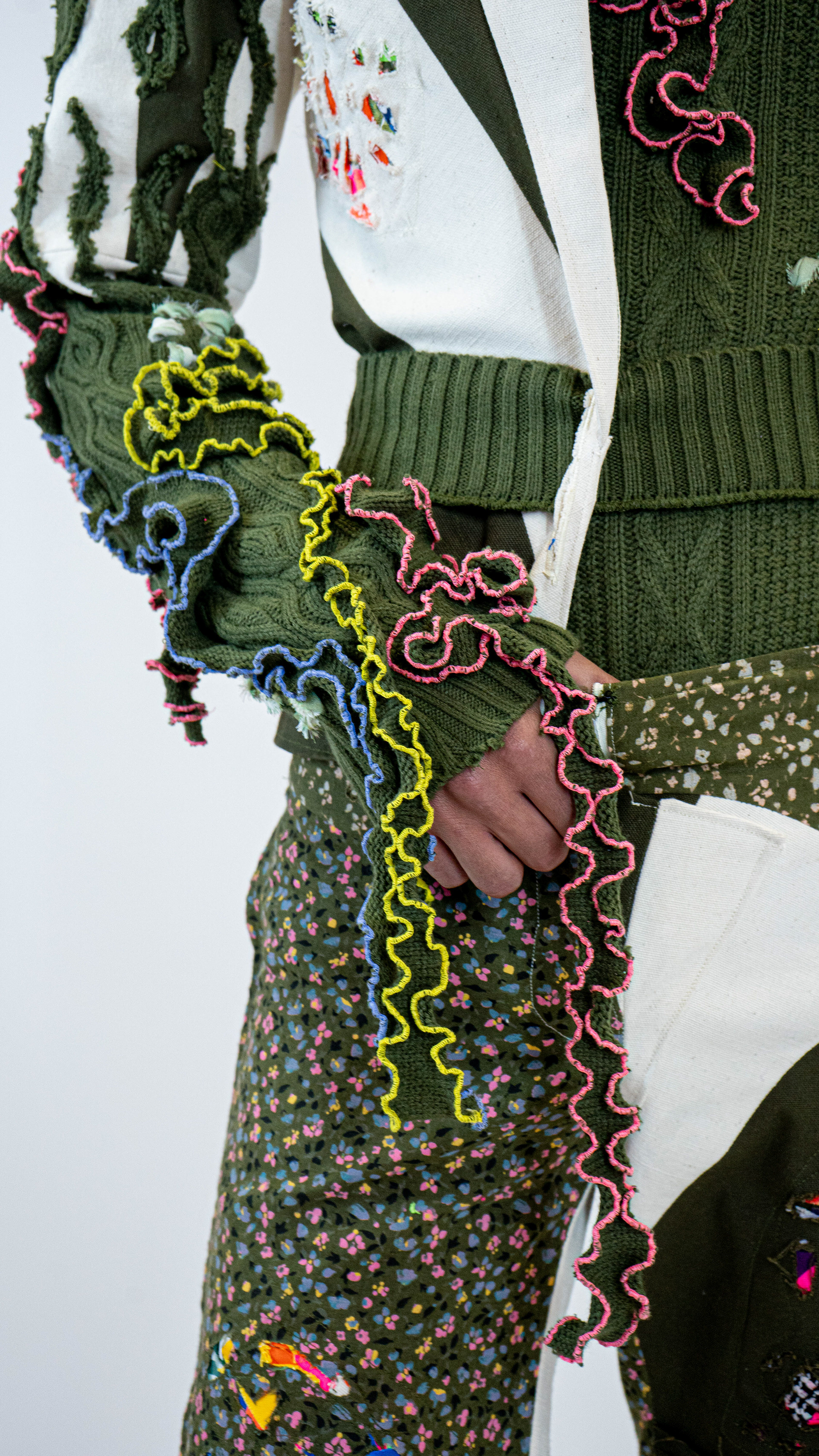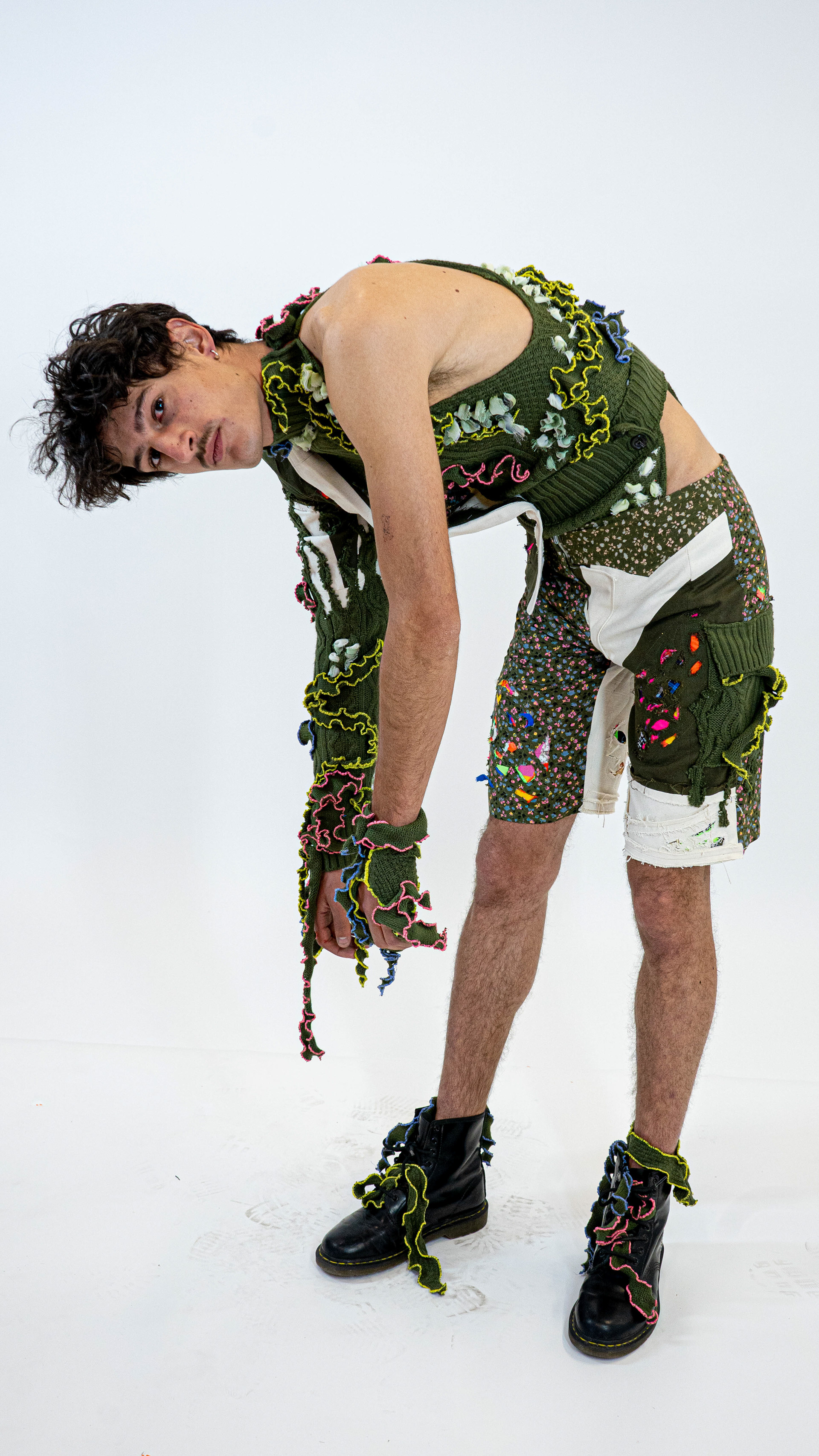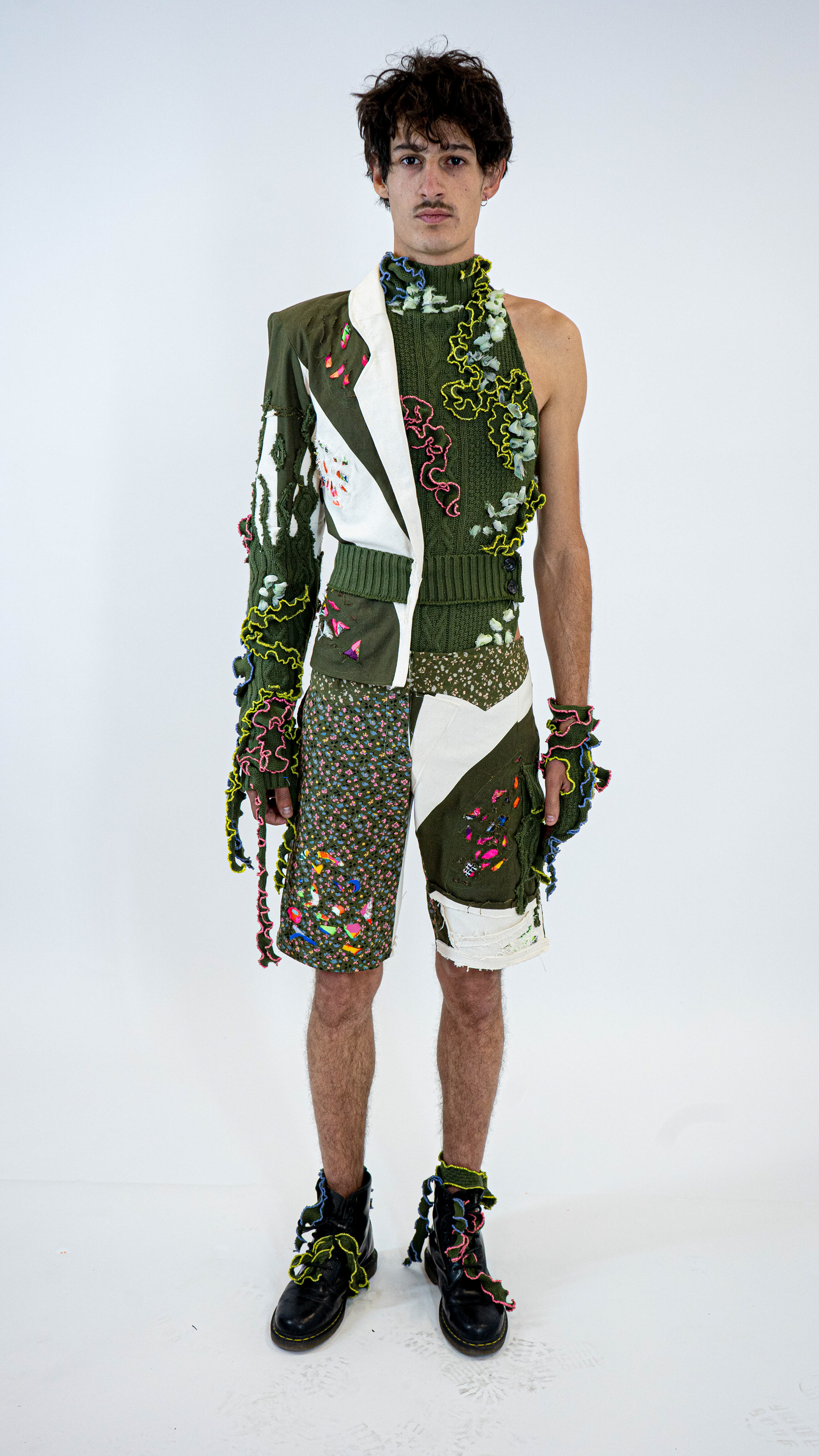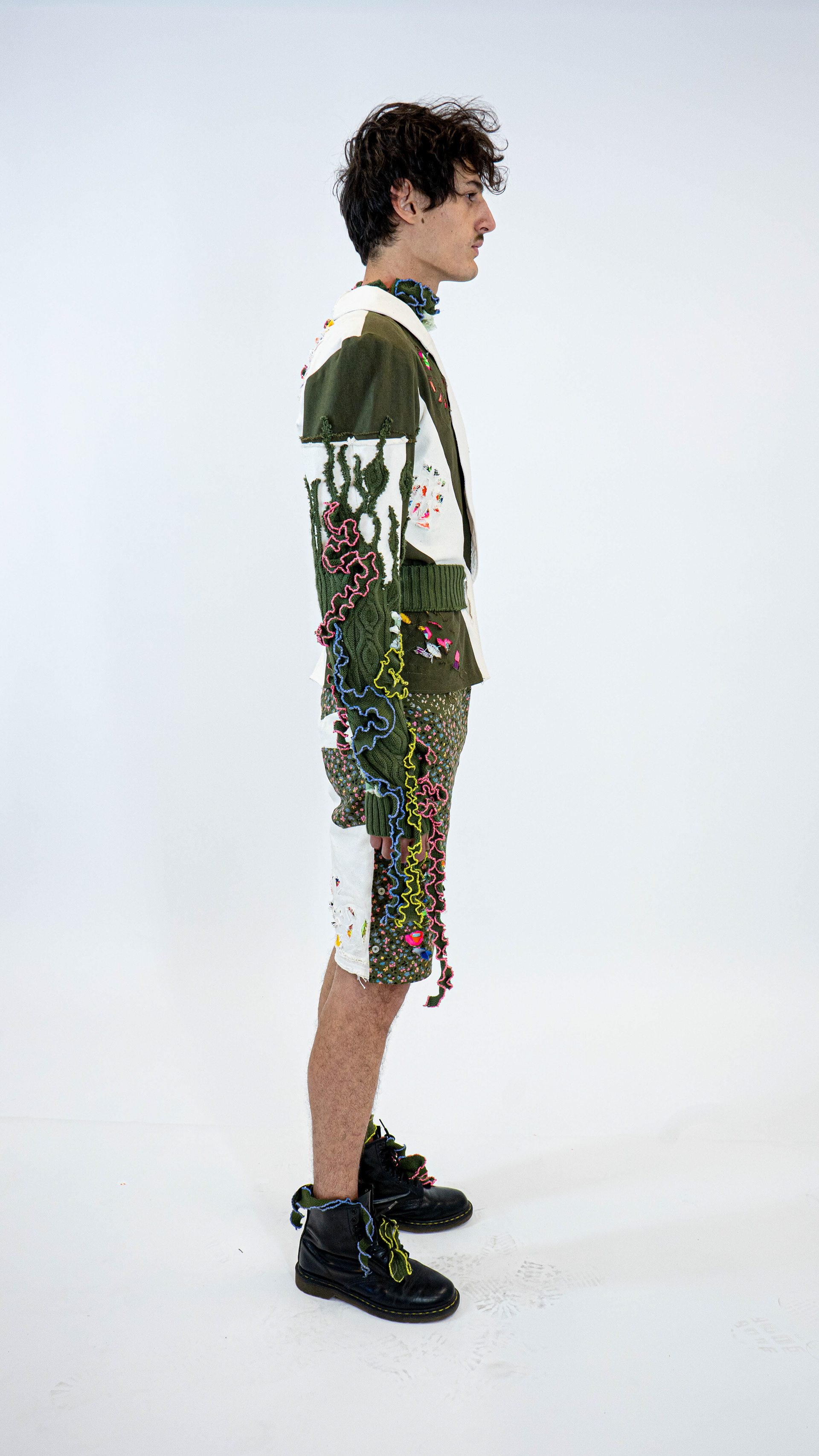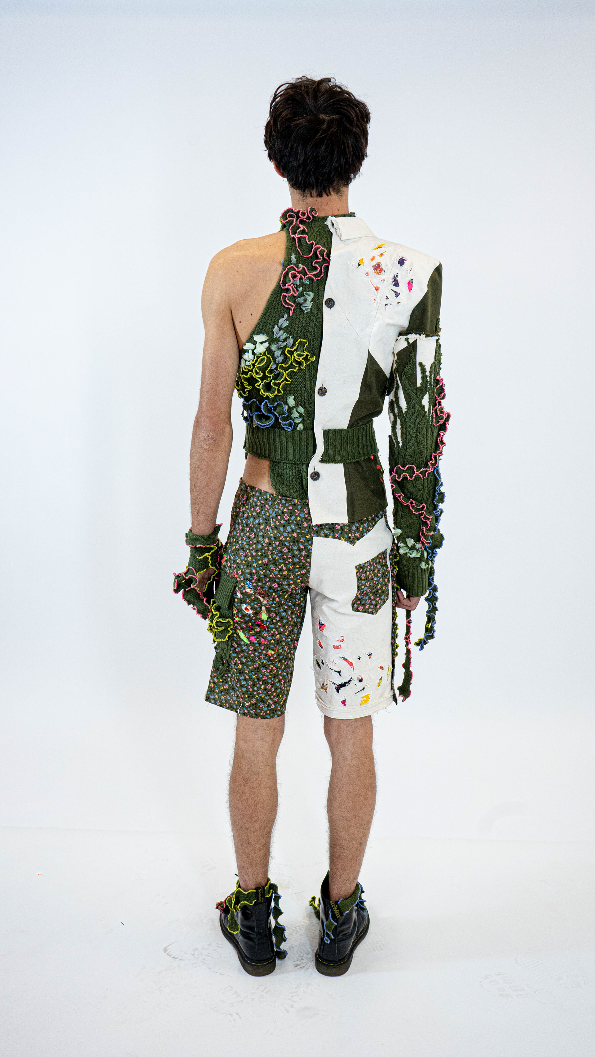 Working with a deconstruction method, I transformed a knitted cardigan and button-up shirt into a set of a knitted bodysuit, a pair of shorts and a tailored jacket.